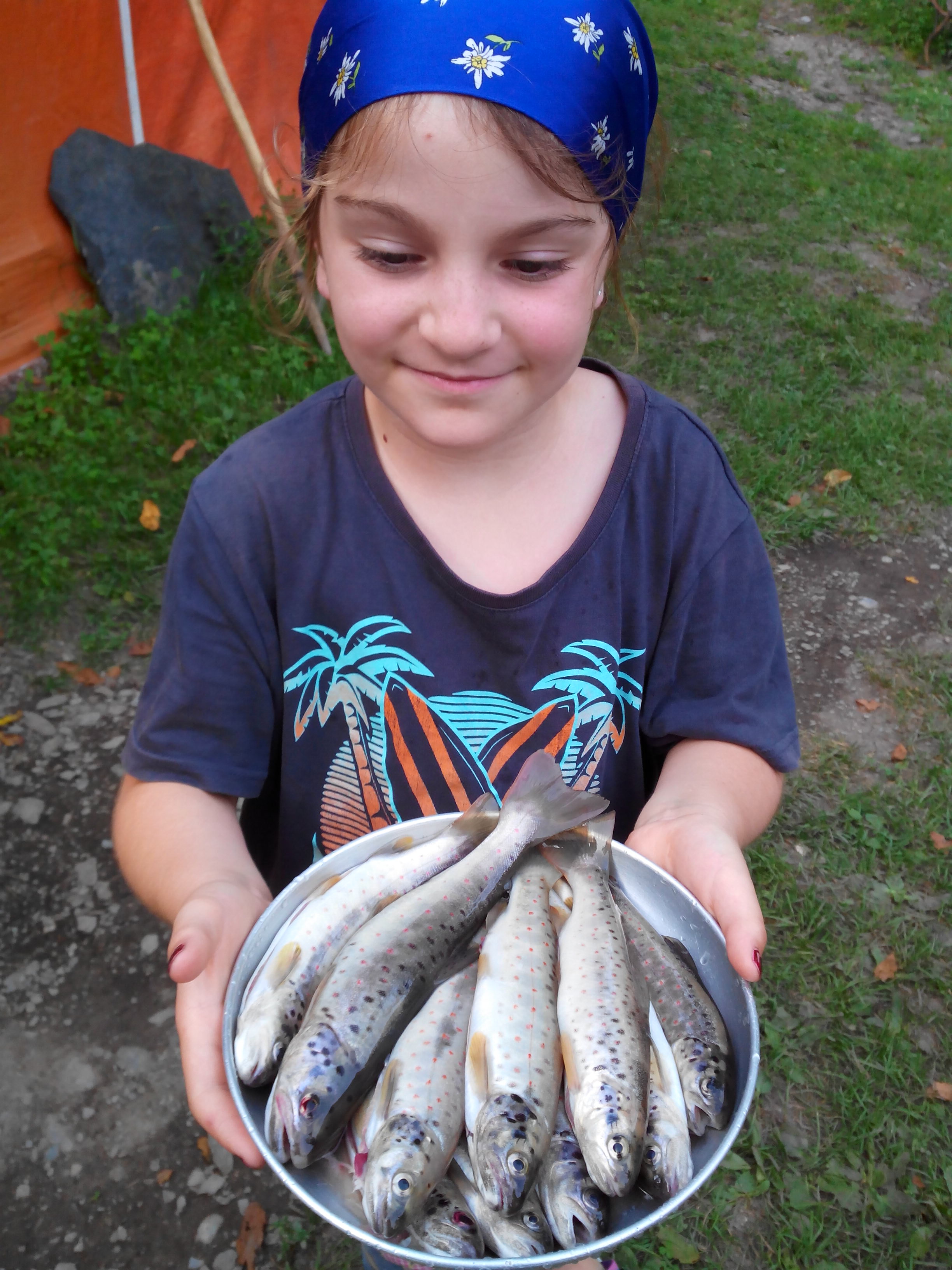 სადილის შემდეგ მდინარეზე ჩავდივართ. ამ მთებში ალაზანი სათავეს იღებს, ამიტომ წყალმცირე მოედინება.