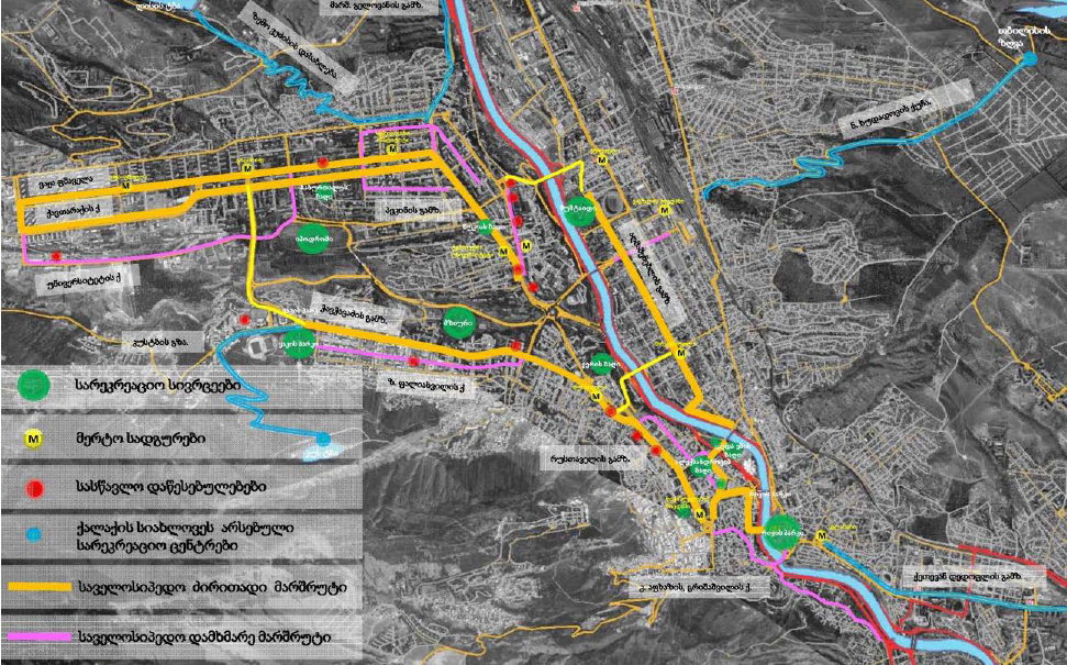 რაც შეეხება საპილოტე მარშრუტს, კონცეფციის მიხედვით, ჯგუფი მიზანშეწონილად მიიჩნევს ვაკის პარკის დედა ენისა და რიყის პარკებთან დაკავშირებას. აღნიშნული მარშრუტისთვის შერჩეულია ჭავჭავაძისა და რუსთაველის სავალი ნაწილის ან ტროტუარის ზოლი. თავისუფლების მოედნიდან ველობილიკი სამ მიმართუილებად დაიყოფა: