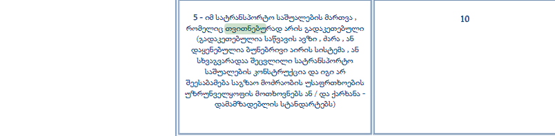 კანონმდებლობაში ეს მუხლი შემდეგნაირად არის განმარტებული: იმ სატრანსპორტო საშუალების მართვა, რომელიც თვითნებურად არის გადაკეთებული (გადაკეთებულია საწვავის ავზი, ძარა, ან დაყენებულია ბუნებრივი აირის სისტემა, ან სხვაგვარადაა შეცვლილი სატრანსპორტო საშუალების კონსტრუქცია და იგი არ შეესაბამება საგზაო მოძრაობის უსაფრთხოების უზრუნველყოფის მოთხოვნებს ან/და ქარხანა-დამამზადებლის სტანდარტებს), გამოიწვევს 100 ლარით დაჯარიმებას და 10 ქულის ჩამოკლებას.