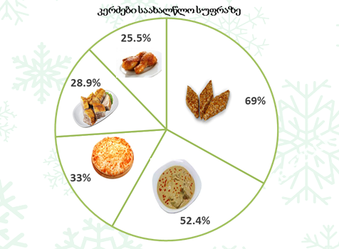 ამასთან, კვლევის მიხედვით, კერძი, რომელიც თითქმის ყველა ოჯახის საახალწლო სუფრაზეა წარმოდგენილი - გოზინაყია. ქართული საახალწლო სუფრის პირველი 5 კერძის წილობრივი მაჩვენებელი მოსახლეობის საახალწლო სუფრაზე ასე გამოიყურება: გოზინაყი (69%), საცივი (52,4%), ხაჭაპური (33%), გოჭის ხორცი (28,9%) და ქათმის ხორცი (25,5%).