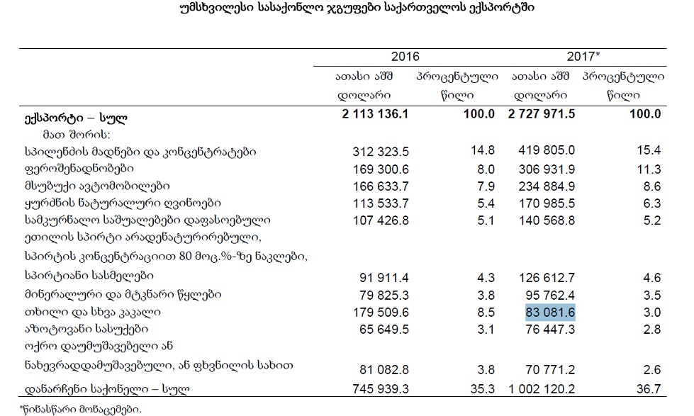 საქართველოდან ექსპორტირებული პროდუქციის ხუთეული ასე გამოიყურება: სპილენძის მადნები და კონცენტრატები, ფეროშენადნობები, მსუბუქი ავტომობილები, ყურძნის ნატურალური ღვინოები, სამკურნალო საშუალებები დაფასოებული ეთილის სპირტი არადენატურირებული,