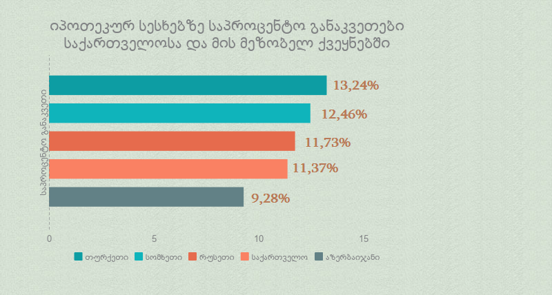 როგორც Numbeo-ს მიერ გამოქვეყნებული სტატისტიკური მონაცემები გვიჩვენებს, მეზობელ ქვეყნებში იპოთეკურ სესხებზე ყველაზე მაღალი საპროცენტო განაკვეთი 13,24% თურქეთში ფიქსირდება, რასაც 12,46%-ით სომხეთი მოსდევს. საქართველოს მეზობელ ქვეყნებში ამ მხრივ მესამე ადგილს რუსეთი 11,73%-ით იკავებს, რომელსაც საქართველო 11,37%-ით მოსდევს.