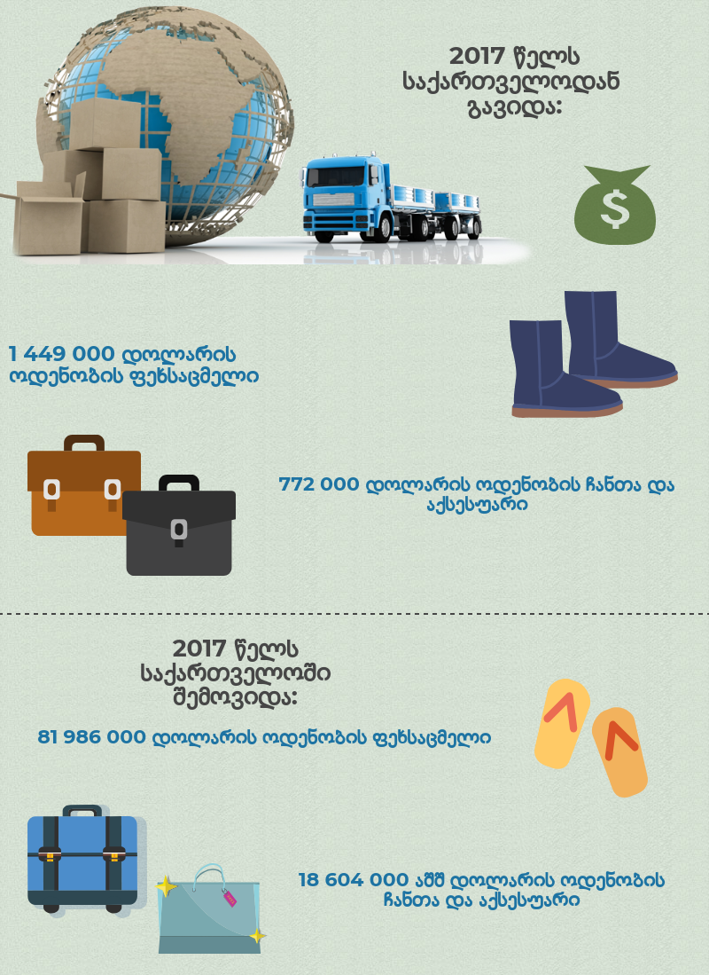 2017 წელს, 1 449 000 აშშ დოლარის ოდენობის ფეხსაცმელი და 772 000 აშშ დოლარის ოდენობის ჩანთა და აქსესუარი გავიდა ექსპორტზე. ამის შესახებ საუბარია კვლევაში, რომელიც საერთაშორისო საკონსულტაციო კომპანია KPMG-მ მოამზადა. KPMG-ს აღნიშნული კვლევა სააგენტომ "აწარმოე საქართველოში" დაუკვეთა.