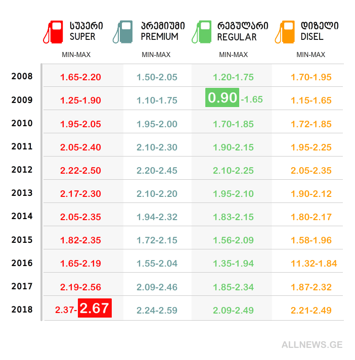 ნავთობპროდუქტების იმპორტიორთა კავშირის მიერ ALLNEWS.GE-სთვის მოწოდებული ინფორმაციის მიხედვით, 2008-2018 წლების განმავლობაში ბენზინისა და დიზელის მინიმალური და მაქსიმალური ფასები საქართველოში მდებარე ავტოგასამართ სადგურებში ასეთი იყო: