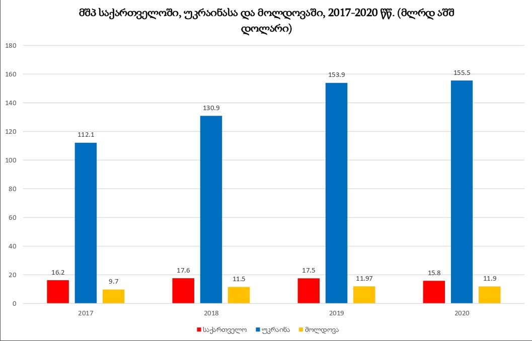 რამდენიმე წლის განმავლობაში, ერთ სულ მოსახლეზე მთლიანი შიდა პროდუქტის მიხედვით, უკრაინასა და მოლდოვაზე უკეთესი მაჩვენებელი საქართველოს ჰქონდა. თუმცა, როგორც სტატისტიკიდან ჩანს, 2020 წლიდან საქართველოზე უკეთესი მონაცემი მოლდოვას აქვს.