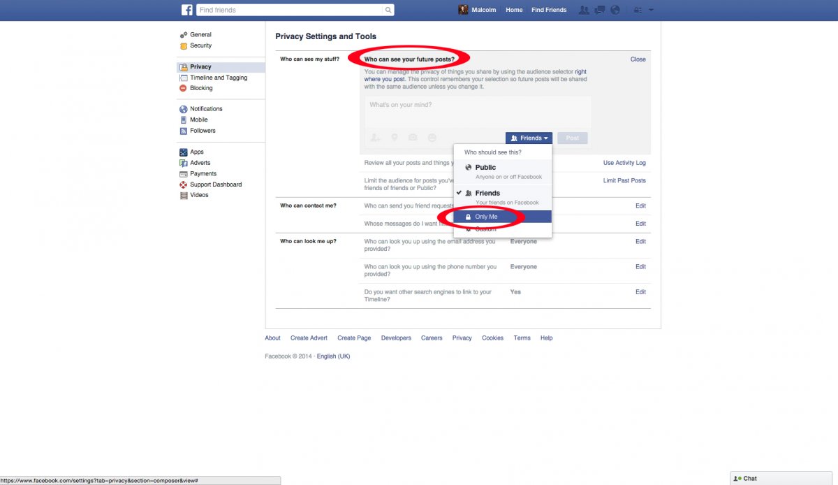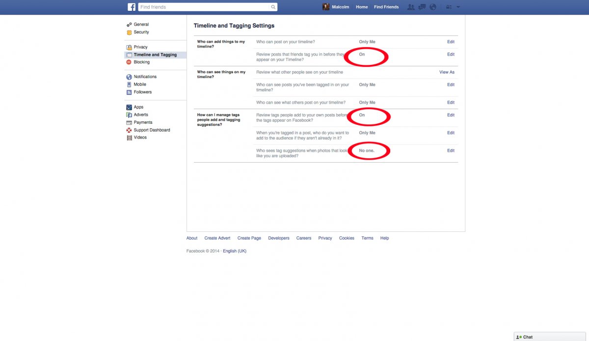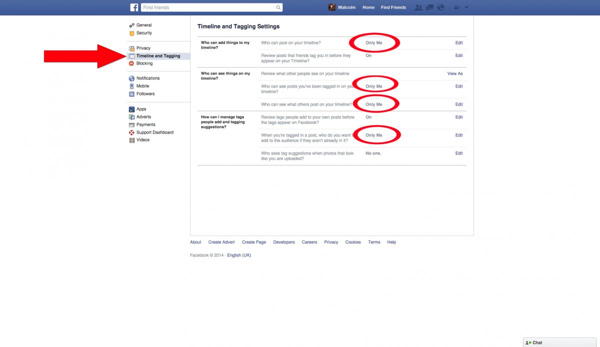 ამჯერად "ქრონიკებისა და მონიშვნის" მენიუში უნდა გადახვიდეთ და დარწმუნდეთ, რომ ყველა არსებულ კითხვაზე თქვენი პასუხია "მხოლოდ მე", მაგალითად, "ვის შეუძლია პოსტის განთავსება თქვენს ქრონიკაზე?"- ამ და სხვა მსგავს კითხვაზე დაკლიკებისას უნდა მიუთითოთ "მხოლოდ მე".