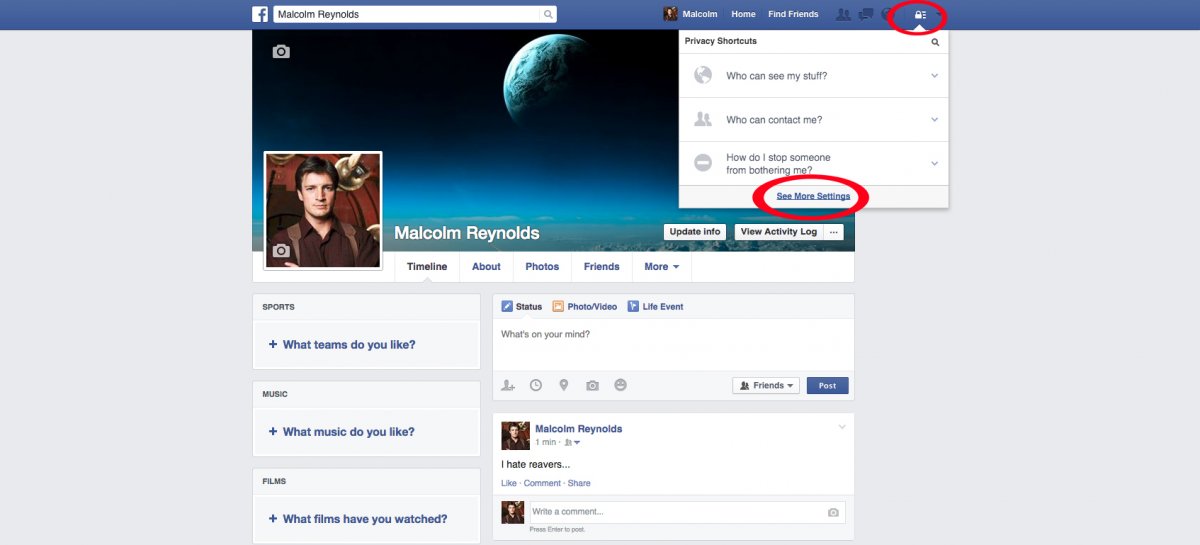 პირველად დააკლიკეთ თქვენი Facebook-ის გვერდზე ზედა მარჯვენა კუთხეში კითხვის ნიშნის ღილაკს, აირჩიეთ ღილაკი Privacy Shortcuts, შემდეგ კი "იხილეთ მეტი პარამეტრი".