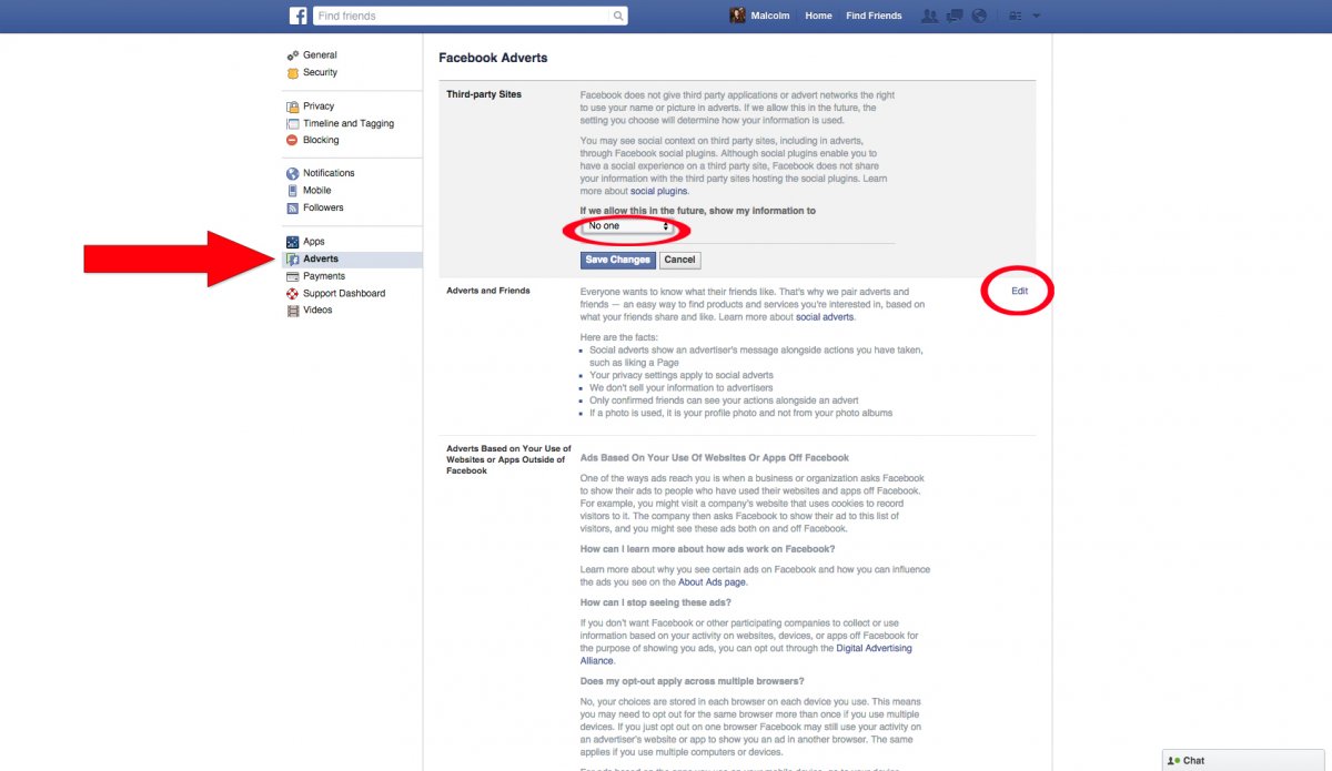 ასევე შეგიძლიათ შეხვიდეთ რეკლამის მენიუში და იმ შემთხვევაში თუ არ გსურთ, რომ თქვენს სახელსა და სოციალურ აქტივობებს რეკლამები შეესაბამებოდეს, გათიშეთ და დახურეთ ყველა შესაძლო ველი.