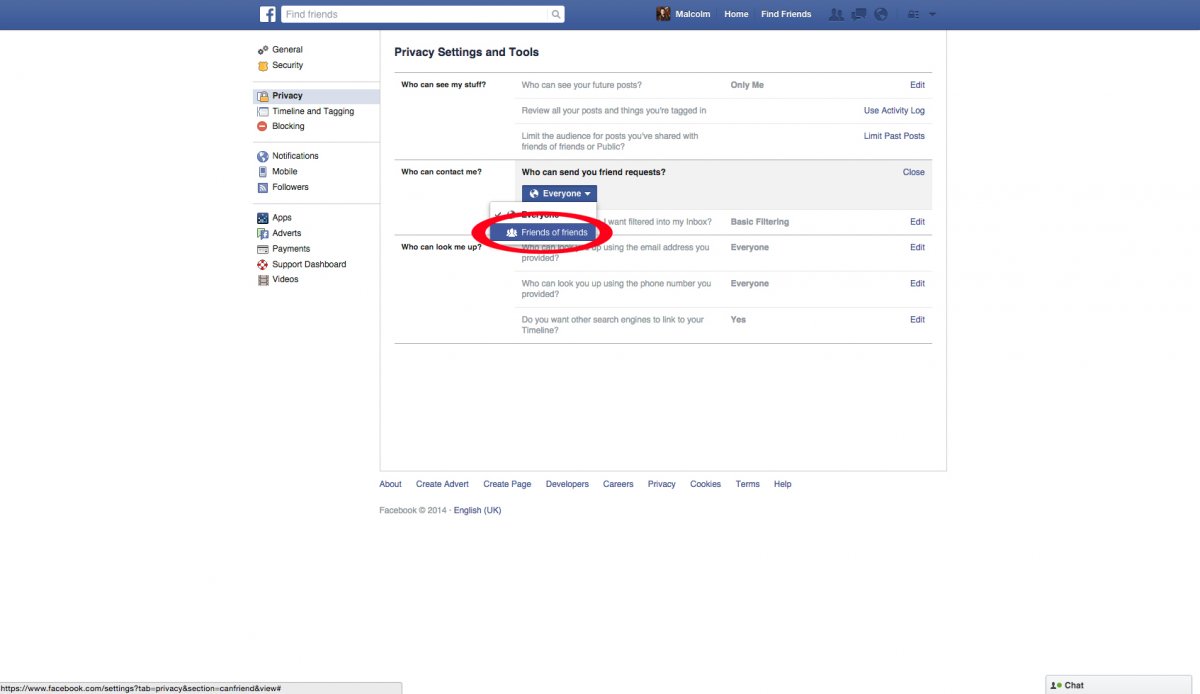 შემდეგ ეტაპზე ის პარამეტრი შეცვალეც სადაც გეკითხებიან "ვის შეუძლია მეგობრობის გამოგზავნა?" ამ ღილაკზე დაკლიკებისას "ყველა" შეცვალეთ "მეგობრების მეგობრებით".