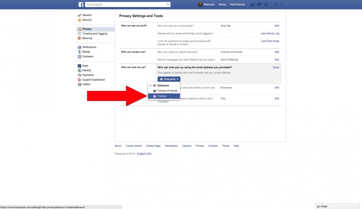 იმისთვის რომ სოციალური ქსელის მომხმარებლებმა მეილის დახმარებით ვეღარ მოგძებნონ, დააკლიკეთ კითხვაზე: "ვის შეუძლია მოგძებნოთ ელ. ფოსტის მისამართით" და "ყველას" ნაცვლად "მეგობრები" აირჩიეთ.