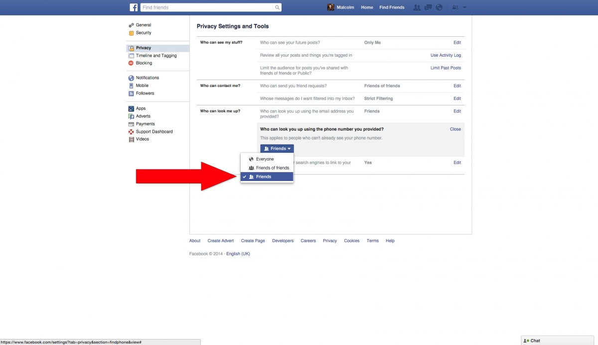 იმისთვის, რომ სოციალური ქსელის მომხმარებლებმა თქვენი ტელეფონის ნომრის დახმარებით ვეღარ მოგძებნონ, დააკლიკეთ კითხვაზე: "ვის შეუძლია მოგძებნოთ თქვენი ტელეფონის ნომრით?" და ამ შემთხვევაშიც "ყველა" შეცვალეთ "მეგობრებით".