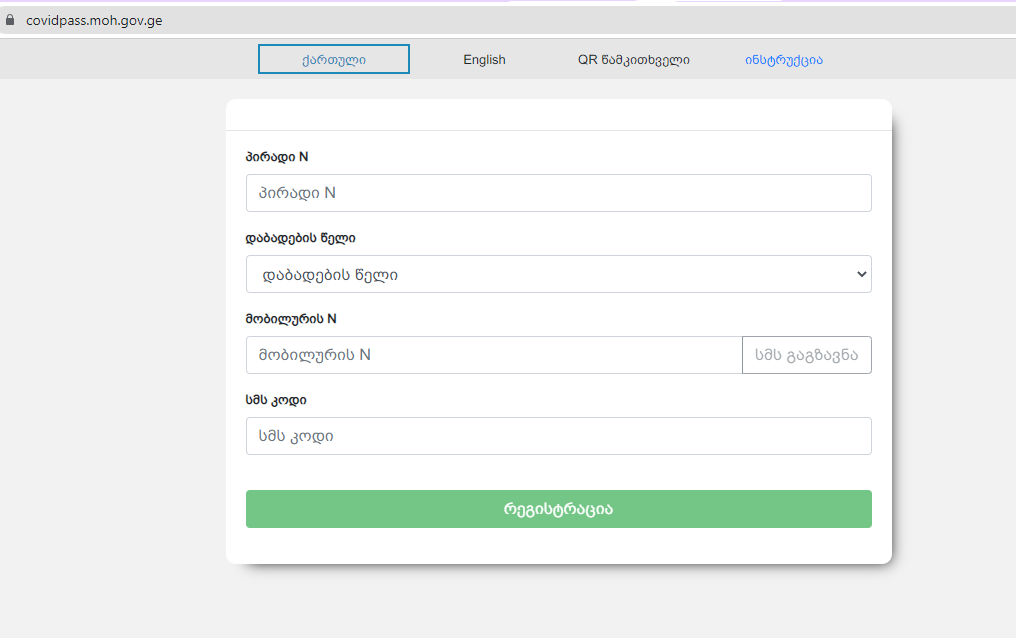 1. ე.წ. მწვანე პასპორტის ასაღებად უნდა გადახვიდეთ ვებ-გვერდზე covidpass.moh.gov.ge, სადაც პირად მონაცემებს შეიყვანთ, რის შემდეგაც თქვენს მობილურ ტელეფონზე SMS კოდი გამოიგზავნება.