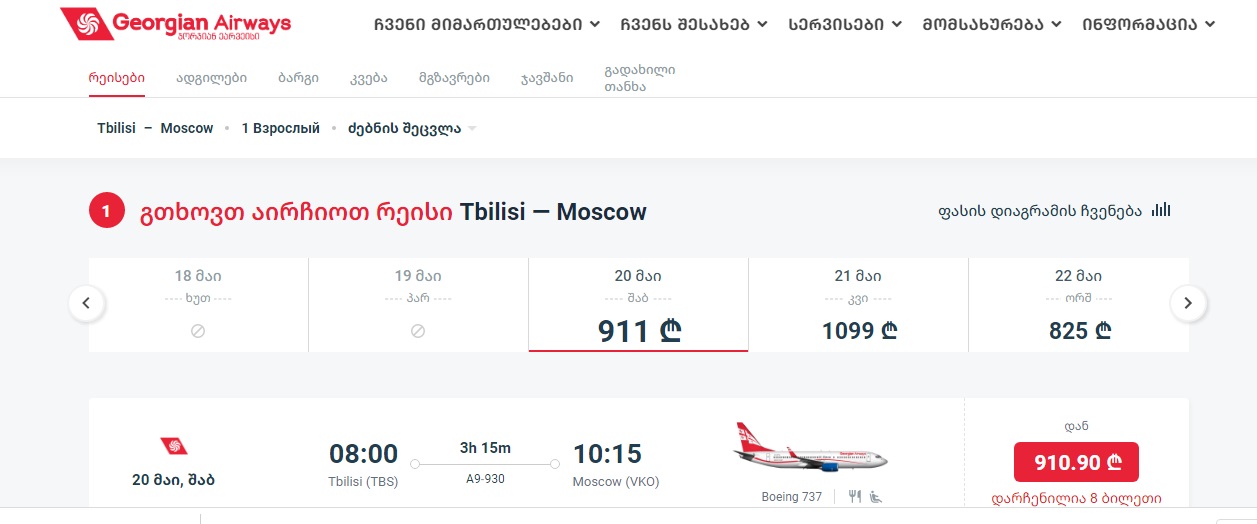 როგორც Georgian Airways-ს საიტზეა მითითებული თბილისი-მოსკოვის მიმართულებით ბილეთის ფასი მაისის განმავლობაში 900-1200 ლარის ფარგლებში მერყეობს. 20 მაისს კი ბილეთის საფასური 911 ლარს შეადგენს.