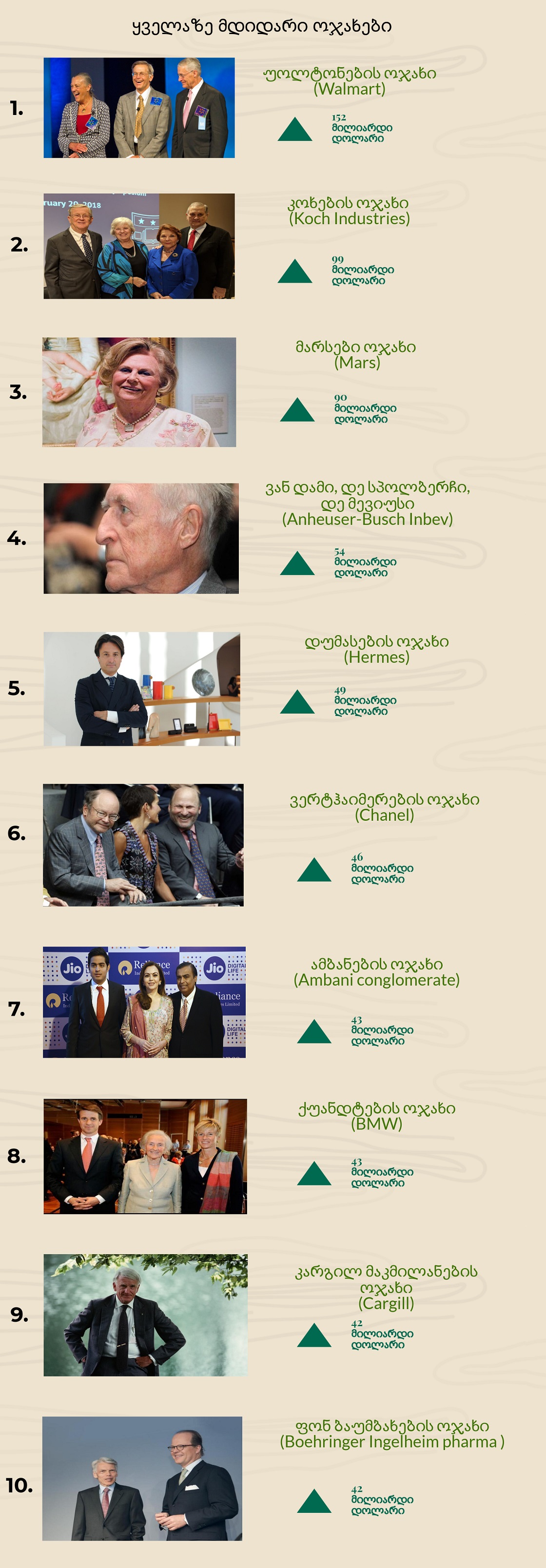 ბლუმბერგის ცნობით, მსოფლიოში 25 ყველაზე მდიდარი ოჯახის საერთო ქონება 1.1 ტრილიონ დოლარს აღწევს. თუმცა, გამოცემის ცნობით, ზოგიერთი მდიდარი ოჯახის შემოსავლების დათვლა საკმაოდ რთულია, ამიტომაც ყველაზე მდიდარი ოჯახების საერთო ქონება სინამდვილეში გაცილებით მეტი იქნება.