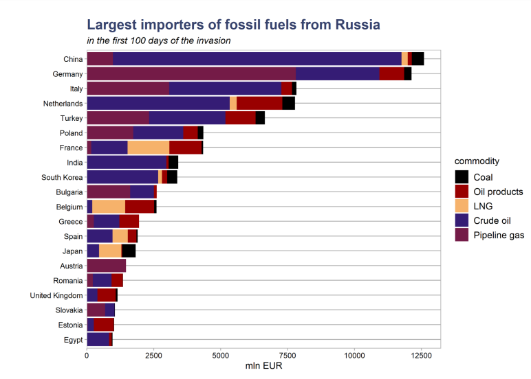 ეს შემოსავალი მნიშვნელოვან როლს თამაშობს რუსეთის სამხედრო აგრესიის დაფინანსებაში. ქვეყნების ჩამონათვალი, რომლებიც რუსული ენერგომატარებლების შესყიდვას აგრძელებენ, შემდეგნაირად გამოიყურება: