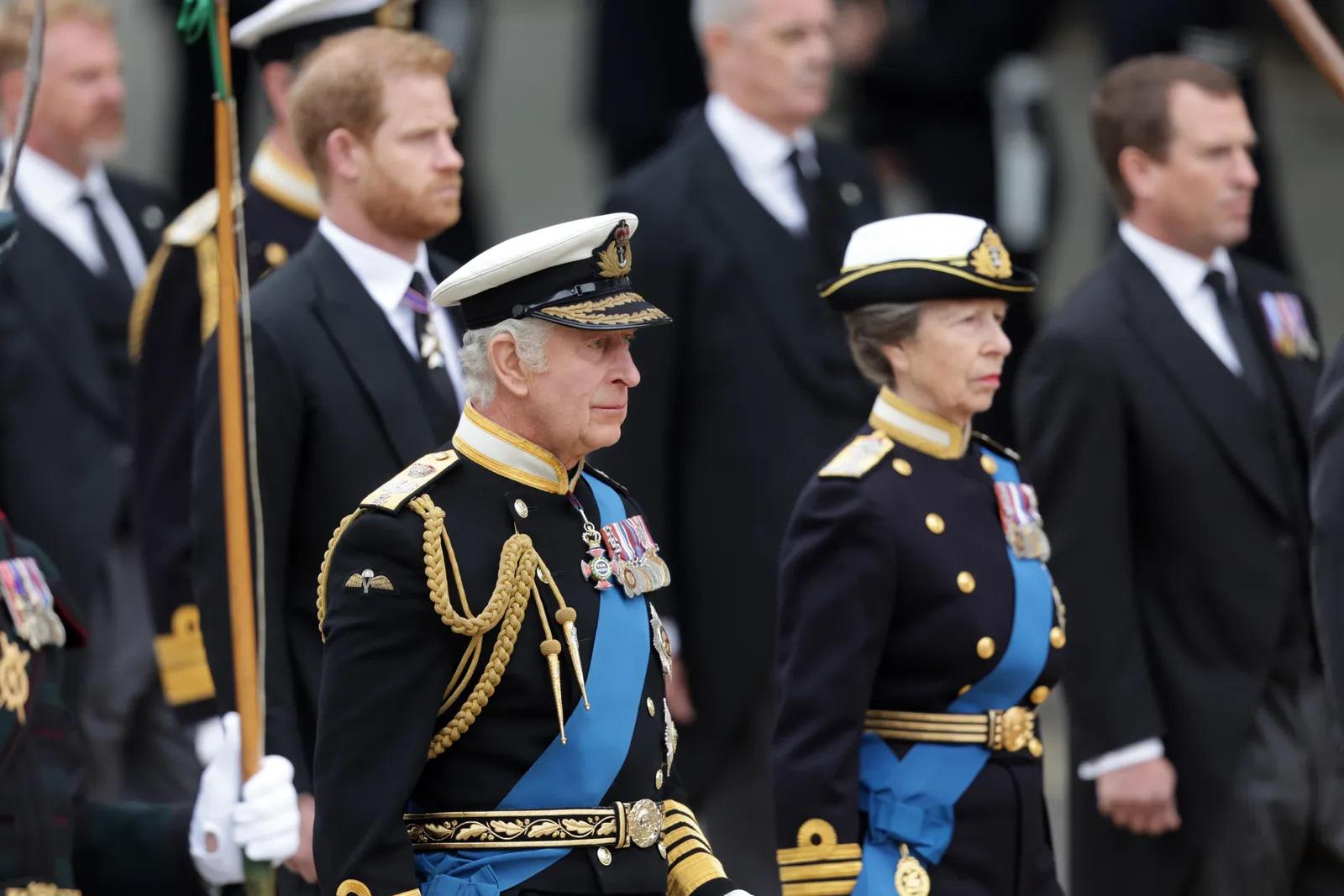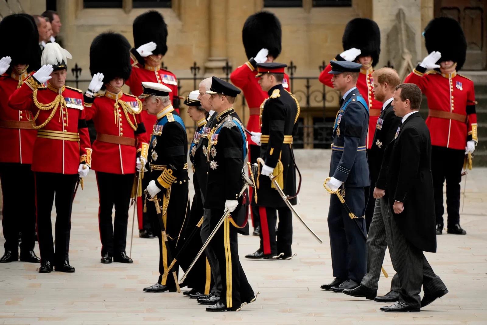 მეფე ჩარლზ III და პრინცესა ანა დედის სასახლეს უკან მიჰყვებოდნენ, როდესაც ცხედარი ვესტმინსტერის დარბაზიდან ვესტმინსტერის სააბატოში გადაჰყავდათ.