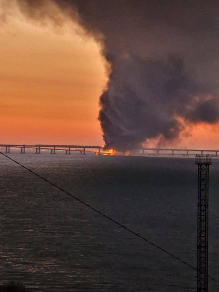 რუსული მედიის ცნობით, ხიდზე ძლიერი ხანძარია და იქ ხალხს არ უშვებენ. მათივე ინფორმაციით, ხიდზე საწვავის ავზი იწვის.