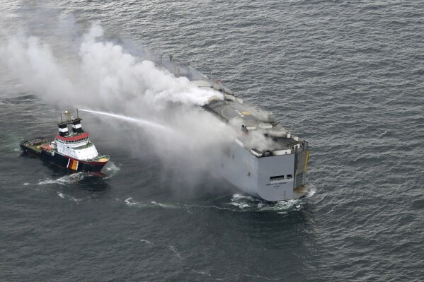 ნიდერლანდებში გემზე, რომელსაც 3 000-ზე მეტი ავტომობილი გადაჰქონდა, ხანძარი გაჩნდა- ფოტოები შემთხვევის ადგილიდან