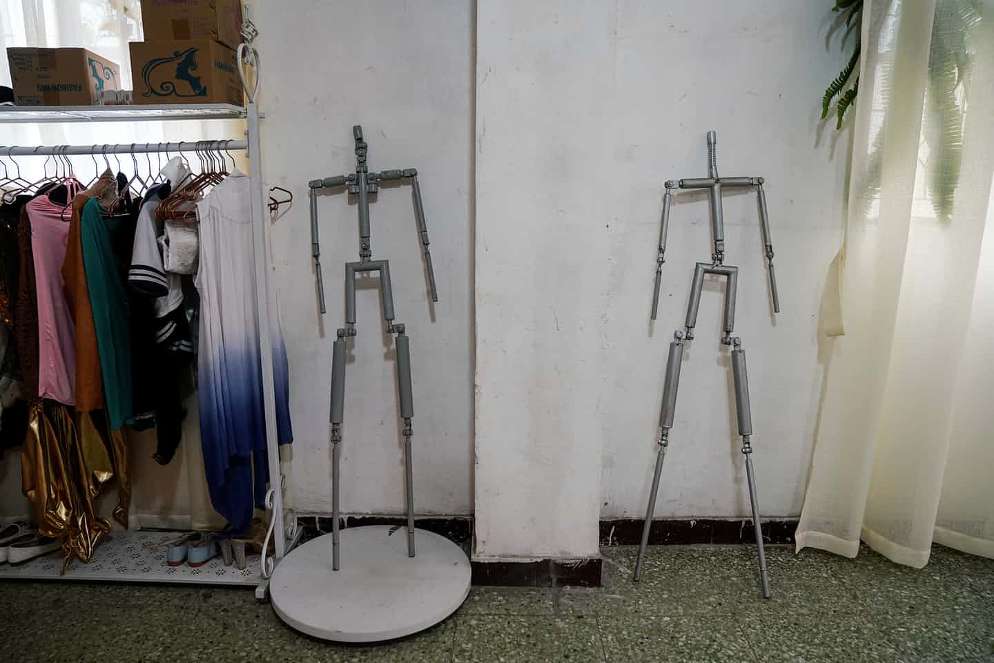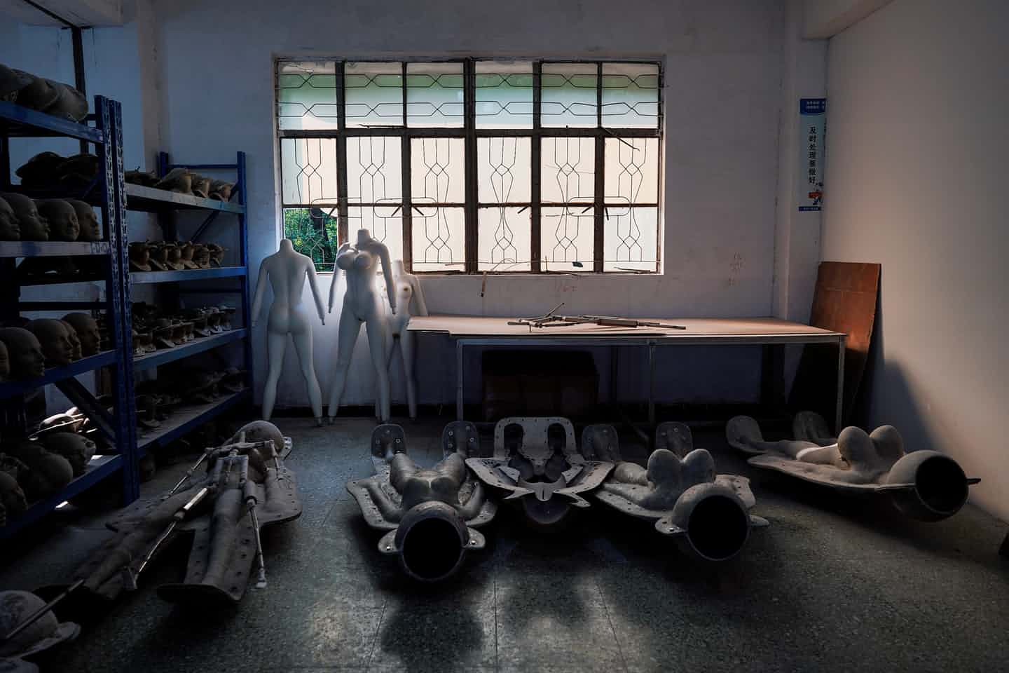 სახელოსნოს იატაკზე სხეულის სხვადასხვა ფორმების გამოსაყვანად საჭირო მრავალფეროვანი ყალიბები აწყვია.