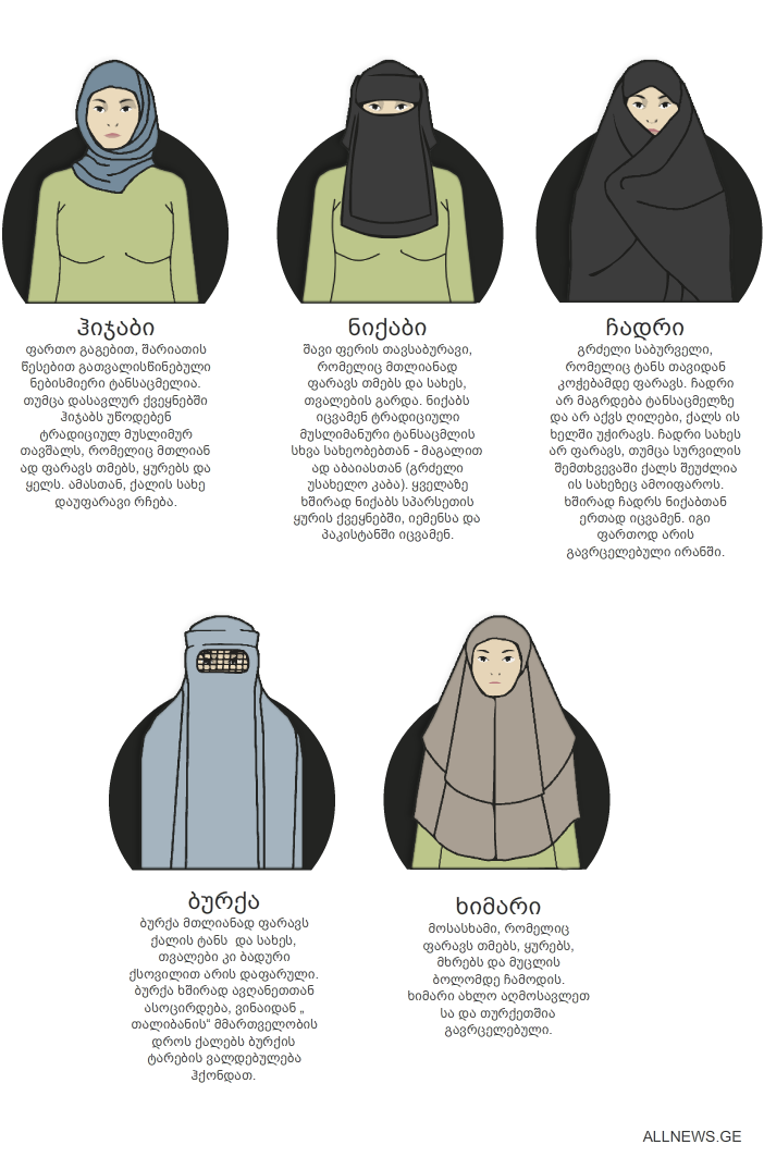 რა განსხვავებაა მუსლიმანი ქალების თავსაბურავებს შორის და ქვეყნები, რომლებიც მათ ტარებას კრძალავენ - ინფოგრაფიკა