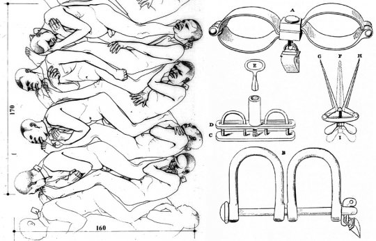 ინგლისურ გემზე, «ბრუქსიზე» – ცოცხალი ტვირთი განთავსების სქემა. გასაკვირი არ არის, რომ ასეთი პირობების გამო, მონების 10 - 20% გზაში იღუპებოდა.