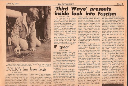 ერთ-ერთ კლასში ჯონსს დაუსვეს კითხვა: როგორ შეიძლებოდა რიგით გერმანელებს უგულებელეყოთ თავიანთ ქვეყანაში საკონცენტრაციო ბანაკების არსებობა? როგორ შეეძლოთ მათ შეგუებოდნენ ფაქტს, რომ მათი თანამოქალაქერ წაიყვანეს და გაანადგურეს? ჯონსს აზრი მოუვიდა, რომ მისი ყველა სტუდენტი ხდებოდა მოძრაობის მონაწილე, სახელწოდებით "მესამე ტალღა". გარედან ეს თამაშს ჰგავდა. მოძრაობის დევიზი იყო: "ძალა დისციპლინის საშუალებით, ძალა საზოგადოების საშუალებით, ძალა მოქმედებით, ძალა სიამაყე."