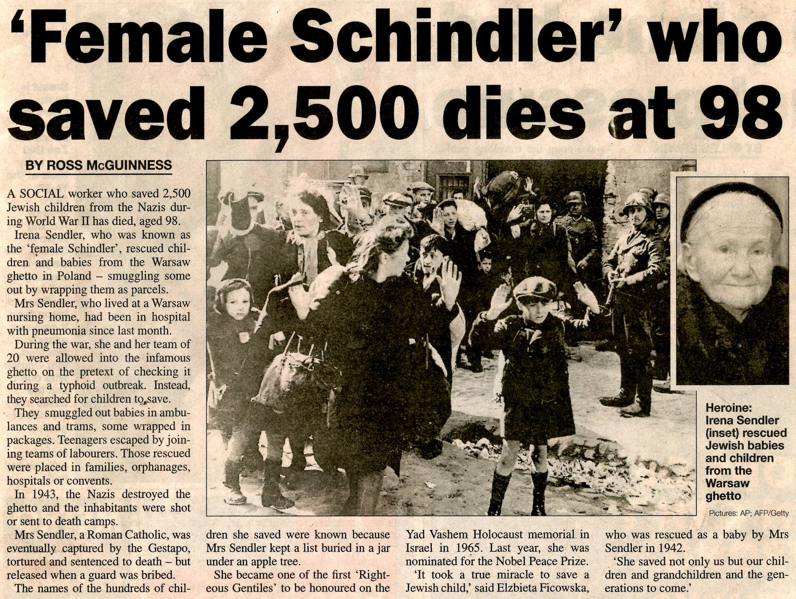 ყველასთვის ცნობილია გერმანელი მეწარმის ოსკარ შინდლერის გმირობის ამბავი, რომელმაც 1 000-ზე მეტი ებრაელი სიკვდილისგან იხსნა. თუმცა, ცოტამ თუ იცის ირენა სენდლერის გმირობის შესახებ, რომელმაც ნაცისტების მიერ დაპყრობილ პოლონეთში 2 500-ზე მეტი ებრაელი ბავშვი გადაარჩინა!