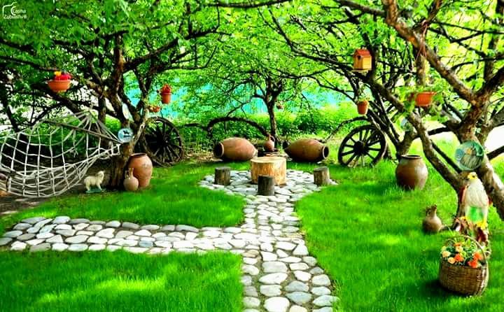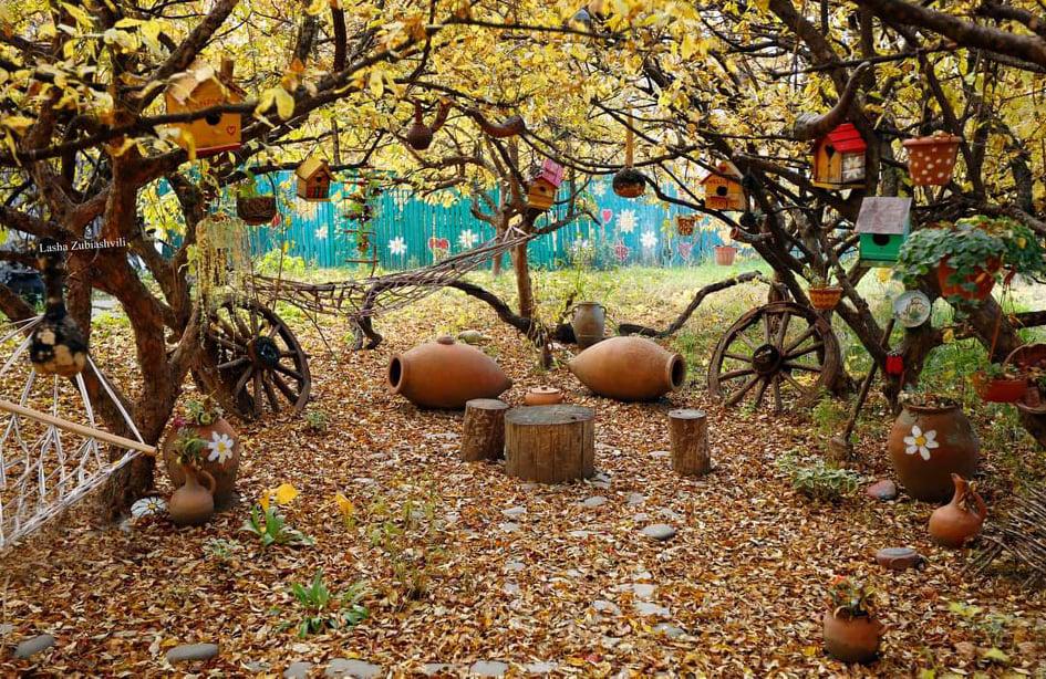 - კი, თან კარგად ისხამს, წელს ნახევარი ტონა დავკრიფეთ. ისეთი დიდები და მაღლებია, რომ ორსართულიანი სახლის სიმაღლეა... მოკლედ, ამ ადგილს ვუყურებდი ბავშვობიდან და ერთხელაც მომინდა, მოდი, მივხედავ-მეთქი. ჯერ 2 ქვევრი დავდე, მერე ურმის თვალი მომცა მეზობელმა, მდინარის ნაპირიდან ნელ-ნელა ქვები ამოვიტანე და ბილიკები გავაკეთე. დავაწყვე დოქები, ბალახი (კოინდარი) დავთესე. ამასობაში ჩიტების სახლი მაჩუქეს. ამან იმისკენ მიბიძგა, რომ მეტი ჩიტის სახლი დამეკიდა. ამისთვის სპეციალურად ნახაზი გავაკეთე და მამაჩემს ვთხოვე, ისინი დაემზადებინა. მოკლედ, ჩიტის 8 სახლი მამამ გააკეთა, ასეთი რაღაცები ეხერხებ... წელს 4 სახლში უკვე დაბინავდნენ ლამაზი ჩიტები, ბარტყებიც დაჩიკეს და უკვე გაფრინდნენ. ფერადები და ლამაზი იყვნენ. აქაურობას უპრობლემოდ მოერგნენ.