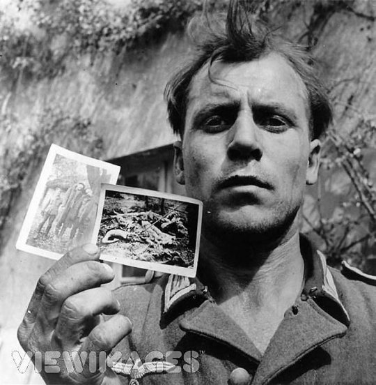 ტყვედ ჩავარდნილი გერმანელი ჯარისკაცი აჩვენებს ფოტოებს, რომლებზე ასახული, როგორ კლავდა და ძალადობდა ხელხზე.