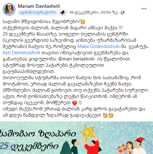 სოფელში შობა დღის ჯადოსნური აურა იგრძნობოდა. ყველა ერთად, დიდი თუ პატარა გულის ფანცქალით ელოდა ნაძვის ხის მორთვას და სანტას გამოჩენას. ყველაზე დიდ სიხარულს ბავშვების სითბოთი და სიხარულით ანთებული თვალები მანიჭებდა. სწორედ ეს იყო ჩემი მოლოდინი, რომ შემძლებოდა ერთი დღე მაინც გვექცია ახალი წლის ტკბილი მოგონებად. და დიახ, ჩემი მოლოდინები ნამდვილად გამართლდა.