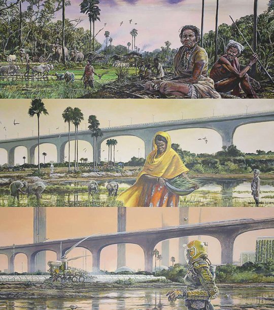 შუა ნახატზე — თანამედროვე ლანდშაფტია. ხოლო, ქვედზე, 2500 წლის მდგომარეობაა ასახული — უდაბნო და მდინარე, წყლის ძალიან დაბალი დონით. ინფრასტრუქტურა მწირია ან დანგრეულია. ხოლო, ადამიანის საქმიანობა — მინიმალურია.