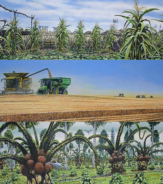 მეორე ნახატი — დღევანდელობას ასახავს. მისთვის მხოლოდ ერთი კულტურის მოყვანა და სასოფლო–სამეურნეო ტექნიკის გამოყენებაა დამახასიათებელი. ბოლო ნახატზე კი, ნაჩვენებია ცხელ და ნოტიო სუბტროპიკულ კლიმატთან ადაპტაციის შედეგი: აქცენტი კეთდება ზეთის პალმების და არიდულ ზონების სუკულენტების მოშენებაზე. პლანტაციებზე ხელოვნური ინტელექტით აღჭურვილი დრონები ზრუნავენ. ადამიანის ფუნქცია კი, მინიმალურია.