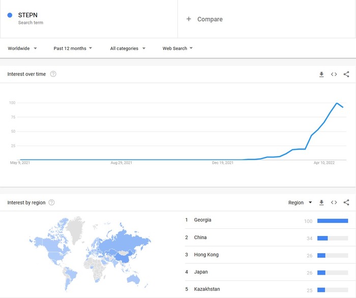 როგორც Google Trends-იდან ვიგებთ, მსოფლიოში STEPN ყველაზე პოპულარული საქართველოშია და მთელი ინტერნეტის მასშტაბით მას ყველაზე ხშირად სწორედ ჩვენთან ეძებენ.