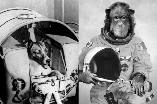 ამიტომ, კოსმოსში პურველად ცხოველები გაუშვეს. მათ შეამოწმეს ჯერ ფიზიკური აქტივობა და რისკები, შემდეგ კი გავლენა ნერვულ სისტემასა და ფსიქიკაზე. სსრკ-მ ძაღლები გააგზავნა ორბიტაზე, აშშ-მ კი მაიმუნები.