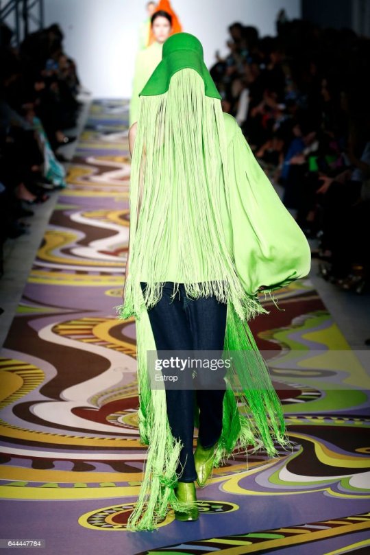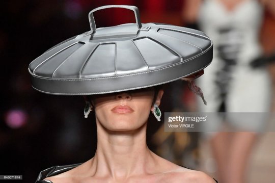მოდელი ორიგინალური ქუდით Moschino-ს ჩვენებაზე