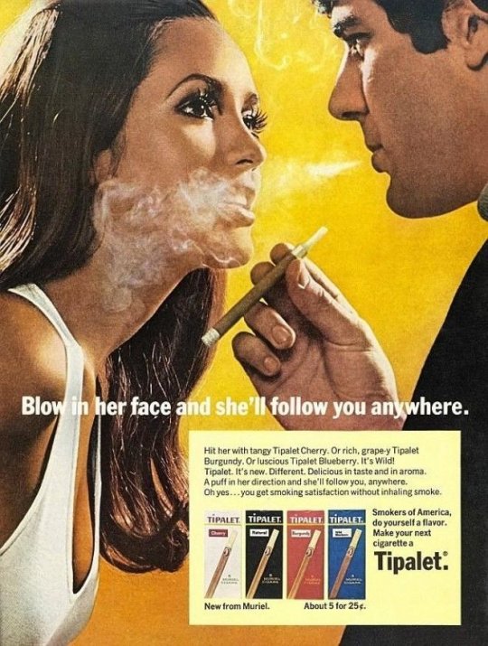 ამრიგად, მამაკაცს შეეძლო ქალიზე ხელის აწევა იმ ყავის გამოც კი, რომელიც მან არ იყიდა. სიგარეტის რეკლამა: „სახეზე მიაბოლე და ის ყველგან გამოგყვება“.