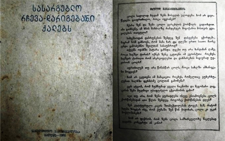 ცოტა ხნის წინ ბებოს ბიბლიოთეკაში ქექვისას, სადაც 1930 წლით დათარიღებულ წიგნებსაც კი წავაწყდი, ერთმა საინტერესო ბროშურამ მიიპყრო ჩემი ყურადღება: "სასარგებლო რჩევა-დარიგებანი ქალებს" - ამოვიკითხე გაცრეცილი, ობმოკიდებული წიგნის გარეკანზე.