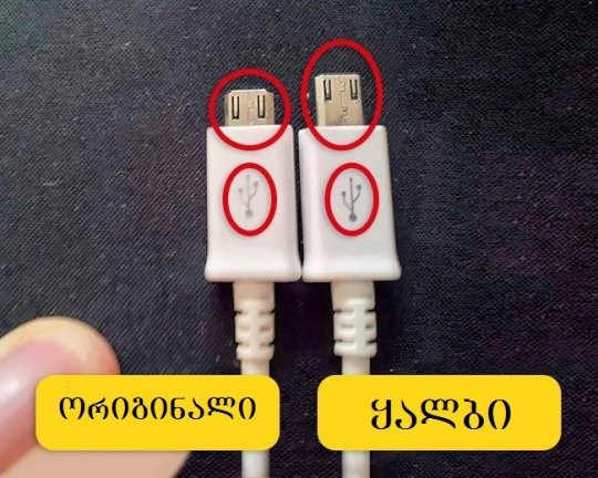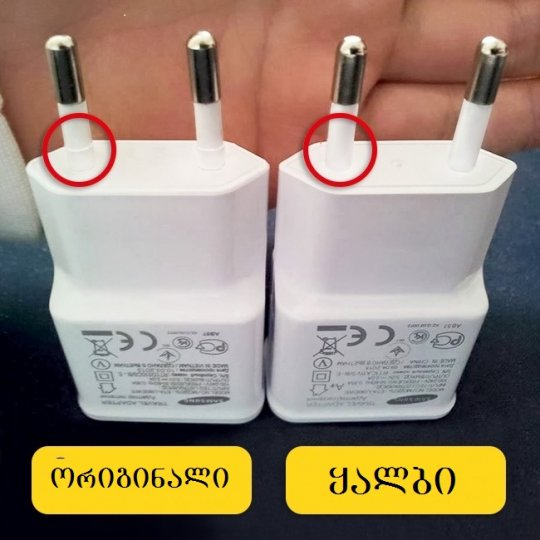 4. შეამოწმეთ ასევე ტელეფონების დამტენი მოწყობილობა. ორიგინალის შემთხვევაში ჩამრთველსა და პლასტმასის კორპუსს შორის გადაბმის ადგილს შეამჩნევთ, მაგრამ თუ კი ის არ არსებობს, საქმე ყალბ დამტენ მოწყობილობასთან გვაქვს. (იხილეთ ფოტო)