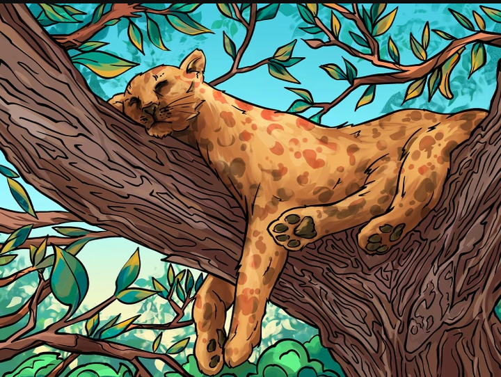 ფოტოზე ერთი შეხედვით ხეზე მყოფი ლეოპარდია გამოსახული, რომელსაც სძინავს.