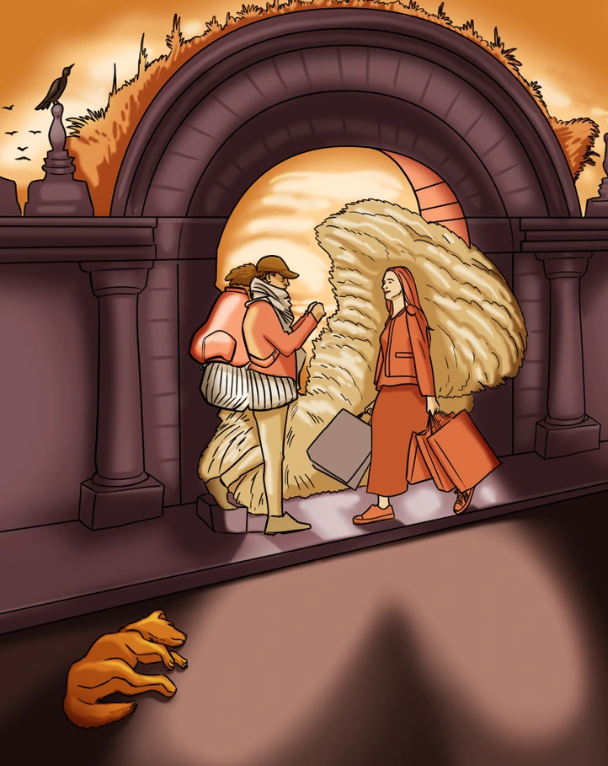 ნახატზე ერთი შეხედვით ორი ადამიანია გამოსახული. მათგან ერთ-ერთი მოგზაურია, მეორე კი, სავარაუდოდ, საყიდლებიდან ბრუნდება.