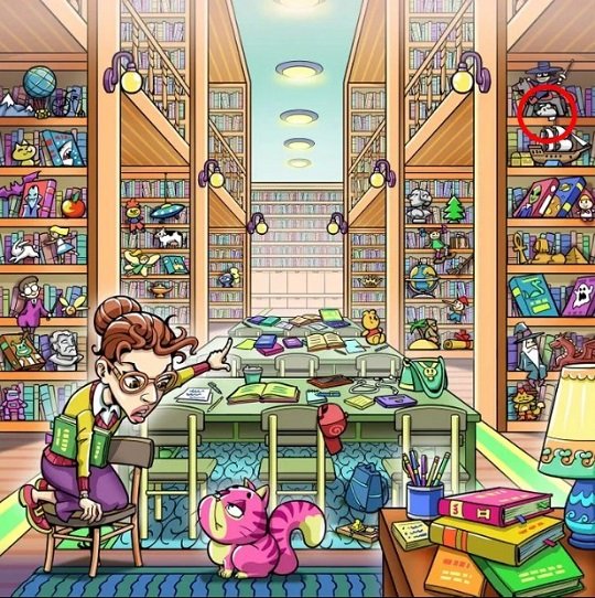 თქვენს წინაშეა გაცოცხლებული ბიბლიოთეკა, სავსე წიგნებით, სათამაშოებით, ქანდაკებებით და ფერადი დეტალებით. ცენტრში ბიბლიოთეკარია, მკაცრი მზერითა და საჩვენებელი თითით, მის გვერდით კი წარბშეკრული კატა ზის.