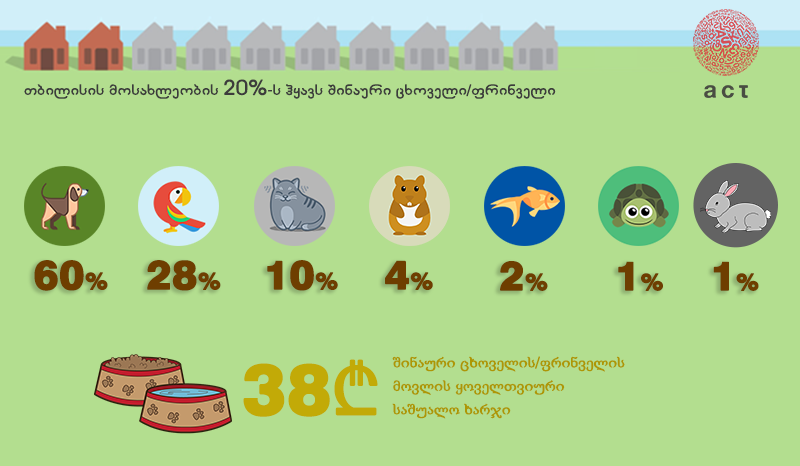 მათ შორის ყველაზე გავრცელებულია ძაღლი (60%). აღსანიშნავია, რომ პოპულარობით მეორე ადგილზე არა კატა (10%), არამედ თუთიყუშია (28%). შინაური ცხოველის/ფრინველის მეპატრონეებს, მათი მოვლისთვის თვეში საშუალოდ 38 ლარი ეხარჯებათ.