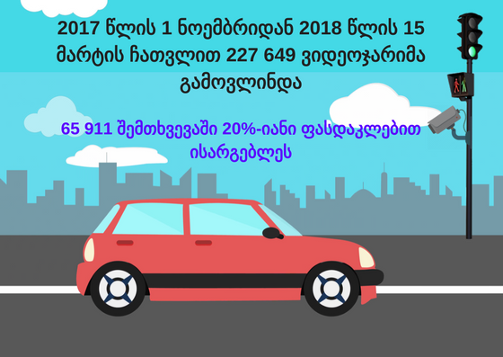 გარდა ამისა, უწყების ინფორმაციით, 2017 წლის 1 ნოემბრიდან 2018 წლის 15 მარტის ჩათვლით პერიოდში გამოვლენილი ვიდეოჯარიმების რაოდენობა შეადგენს 227 649-ს. გადახდისას 20%-იანი ფასდაკლებით კი 65 911 შემთხვევაში ისარგებლეს.