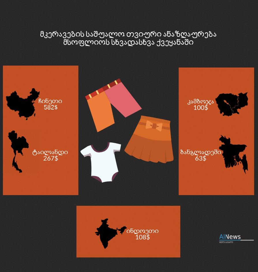 "პროდუქცია იქმნება იქ, სადაც დაბალი ხელფასები და იაფი მუშახელია. საქართველოში, უკრაინაში, სომხეთში, აზერბაიჯანში, თურქეთში, ჩინეთსა და აზიის ქვეყნებში დიდი რაოდენობით პროდუქცია იკერება. ჩვენთან მკერავების საშუალო ხელფასი 400 ლარიდან 500 ლარამდეა. ბოლო პერიოდში ჩინეთში ხელფასები გაიზარდა, თურქეთში ჩვენზე მაღალი ანაზღაურებაა, უკრაინაშიც ჩვენზე ოდნავ მეტია, სომხეთშიც ჩვენნაირად არის და შეიძლება, უფრო ნაკლებიც", - განმარტა მაია სიმონიძემ.