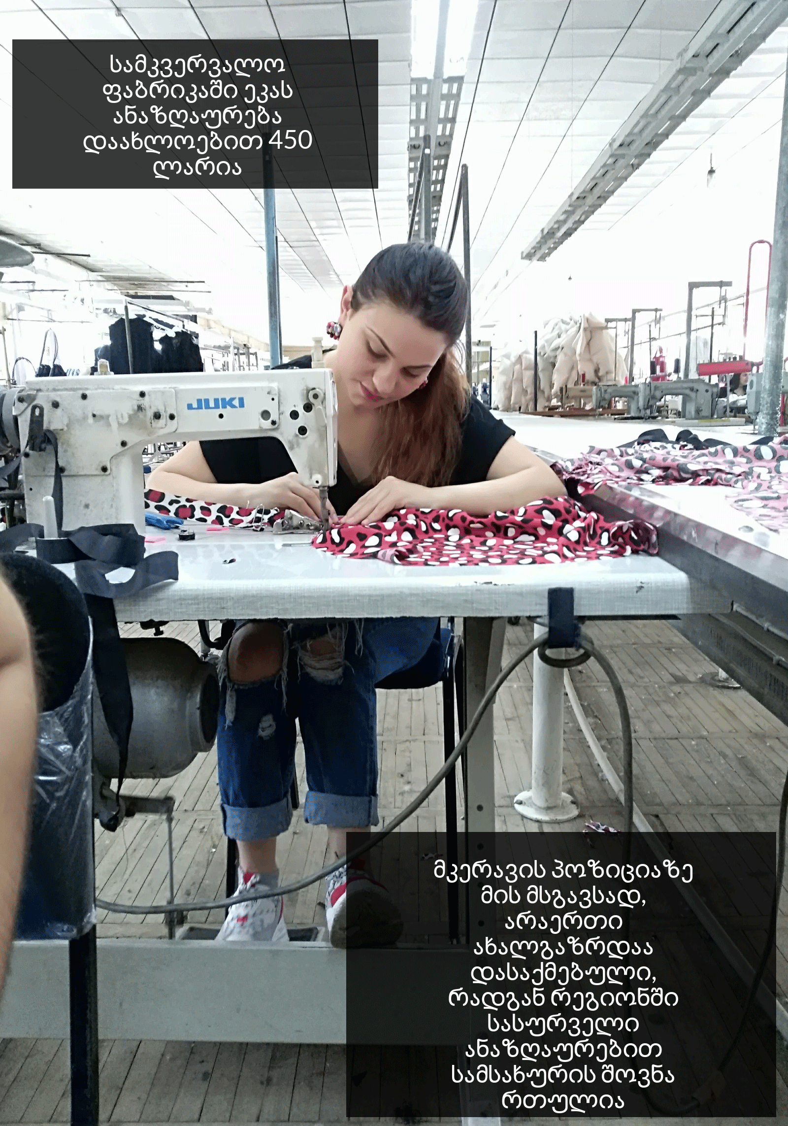 თითქმის ერთი წელია, 27 წლის ეკა მანაგაძე სამკერვალო ფაბრიკა "იმერში" მუშაობს. პროფესიით ფარმაცევტია, თუმცა საკუთარი პროფესიით მუშაობაზე იმერეთის რეგიონში არსებული დაბალი ანაზღაურების გამო უარი თქვა, საზღვარგარეთ წასვლასა და ორი მცირეწლოვანი შვილის მიტოვებას კი არჩია, ბედი სამკვერვალო ფაბრიკაში ეცადა.