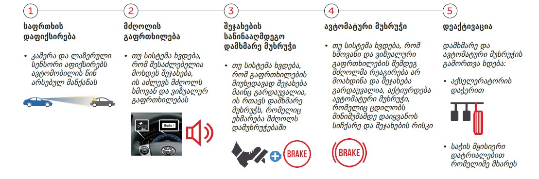 რა თქმა უნდა, არავის სურს ავტოავარიაში მოხვედრა. მაგრამ როდესაც ავარია ხდება, ტოიოტას სურვილია, მინიმუმამდე შეამციროს როგორც ადამიანის ჯანმრთელობის დაზიანება, ასევე ავტომობილის დაზიანებით გამოწვეული ზარალი. ეს არის ერთ-ერთი მიზეზი, რატომაც ტოიოტამ შეიმუშავა შეჯახების საწინააღმდეგო სისტემა. თუ სისტემა რადარის ტექნოლოგიის გამოყენებით დაასკვნის, რომ ავტომობილის წინა მხარეს არსებობს შეჯახების მაღალი ალბათობა, ის მოგცემთ გამაფრთხილებელ ნიშანს. გარკვეულ პირობებში, თუ სისტემა დაადგენს, რომ შეჯახება გარდაუვალია, ის თვითონ დაამუხრუჭებს და დაჭიმავს ავტომობილის ღვედებს.