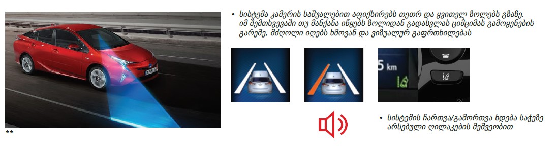 ზოლიდან გადასვლის საწინააღმდეგო გაფრთხილების სისტემის მეშვეობით, თქვენი ტოიოტა შეგატყობინებთ, თუ ის დააფიქსირებს, რომ თქვენი ზოლის ფარგლებს გადაცდით. 50 კმ/სთ-ზე მაღალი სიჩქარით ისეთ გზაზე გადაადგილებისას, რომელსაც გააჩნია ზოლის მონიშვნა, სისტემა იყენებს სპეციალურ კამერას, რომელიც ცნობს ზოლის აღმნიშვნელ ხაზებს და ხვდება, თუ თქვენ მათ გადაუხვევთ. ამ დროს, ავტომობილი გაძლევთ ხმოვან შენიშვნას და ანთებს შესაბამის ნიშანს ხელსაწყოთა პანელზე.