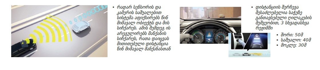 ეს სისტემა იყენებს მილიმეტრულ ტალღათა დიაპაზონზე მომუშავე რადიოლოკაციურ სენსორს და ერთ-ლინზიან კამერას წინმავალი ავტომობილის დასაფიქსირებლად, ასევე მისი გადაადგილების სიჩქარის გამოსათვლელად. ამის შედეგად, ის არეგულირებს თქვენი ავტომობილის სიჩქარეს (წინასწარ მითითებულ ფარგლებში) და ამგვარად გეხმარებათ წინასწარ განსაზღვრული მანქანათაშორისი მანძილის დაცვაში. შემდგომში, მძღოლს შეუძლია ამ მანძილის რეგულირება საჭეზე დამონტაჟებული სამართავის მეშვეობით.