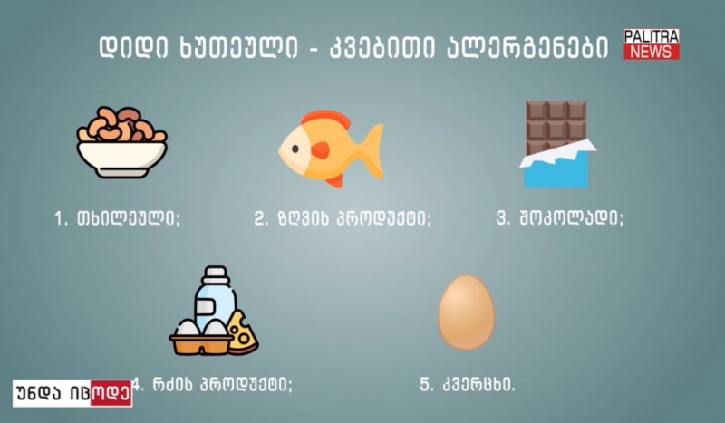 „კვებითი ალერგია აქტუალური თემაა. ხშირად საზოგადოებაში ალერგიასთან დაკავშირებით ბევრი არასწორი ინფორმაცია ვრცელდება. როგორც წესი, ყველა ტიპის გამონაყარი სახეზე ალერგიასთან ასოცირდება, მათ შორის, კვებით ალერგიასთან, რაც არასწორია. კვებითმა ალერგიამ შეიძლება კანზე გარკვეული ტიპის გამონაყარი გამოიწვიოს, მაგრამ ეს არც ისე ხშირად გვხვდება, როგორც საზოგადოებაშია ცნობილი. ზოგადად, არაქისი და თხილეული კვებით ალერგენებში ერთ-ერთ ყველაზე სერიოზულ პროდუქტად ითვლება. არსებობს ე.წ. დიდი ხუთეული, რომლებიც ხშირად მსგავსი ტიპის გამონაყარს იწვევს.
