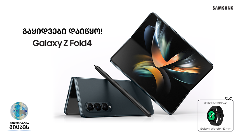 გახსენი შენი სამყარო ახალ Galaxy Z Flip4 და Fold4-თან ერთად. სამსუნგის ოფიციალური პარტნიორების მაღაზიათა ქსელებში უახლესი დასაკეც ეკრანიანი სმარტფონების გაყიდვები უკვე დაიწყო. სასიამოვნო სიახლე სამსუნგის ერთგულ მომხმარებლებს - თუ 11 სექტემბრის ჩათვლით შეიძენ Galaxy Z Fold4-სა და Flip4-ს სამსუნგის ოფიციალურ ჰოლოგრამით, საჩუქრად სმარტ საათს Galaxy Watch4-სა და ეკრანის 1 წლიან გარანტიას მიიღებ; ასევე, მოქმედებს Trade-In აქციაც - შეგიძლია მიიტანო შენი არსებული სმარტფონი, გაცვალო უახლეს ფლაგმანზე და მიიღო განსაკუთრებული ფასდაკლება. ყოველთვის გახსოვდეს, რომ შეიძინო სამსუნგის სმარტფონი მხოლოდ სამსუნგის ოფიციალური ჰოლოგრამით.